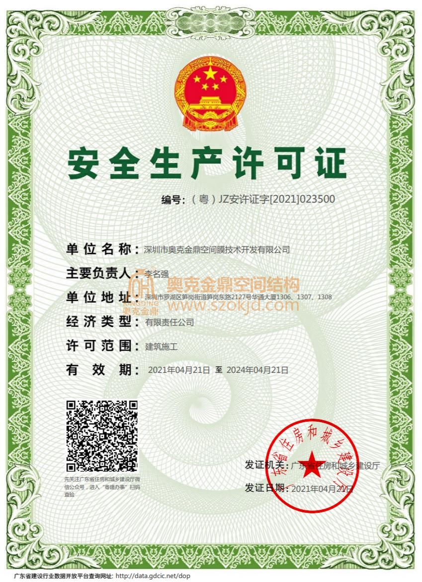 鋼結構工程安裝貳級,膜結構工程設計壹級,膜結構工程施工壹級,具備安全生產許可證。